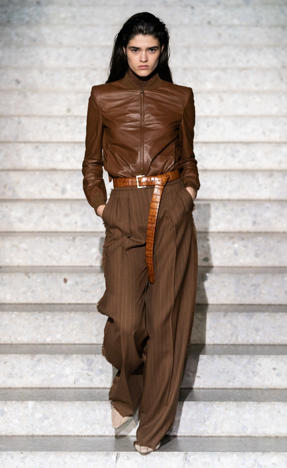 Стоит отметить и брючные костюмы, которых больше всего было представлено на шоу. Острые плечи и широкие брюки перенесли нас к временам популярности Марлен Дитрих и музыканта Дэвида Боуи .
